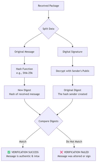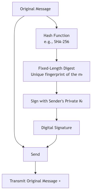Key Point: The message itself is not encrypted. Only its hash is encrypted to create the signature. If confidentiality is needed, the entire message + signature would be encrypted again using a method like TL