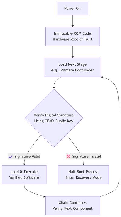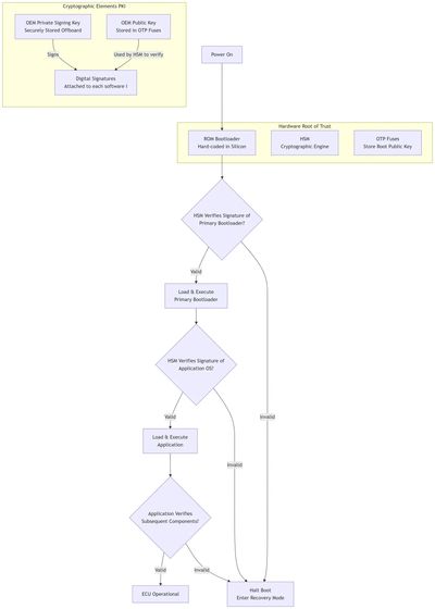 In summary, Secure Boot is a elegant but complex interplay between immutable hardware (HSM, OTP, ROM) and cryptography (PKI, Signatures) to ensure that only software blessed by the OEM can control the vehicle's electronics.